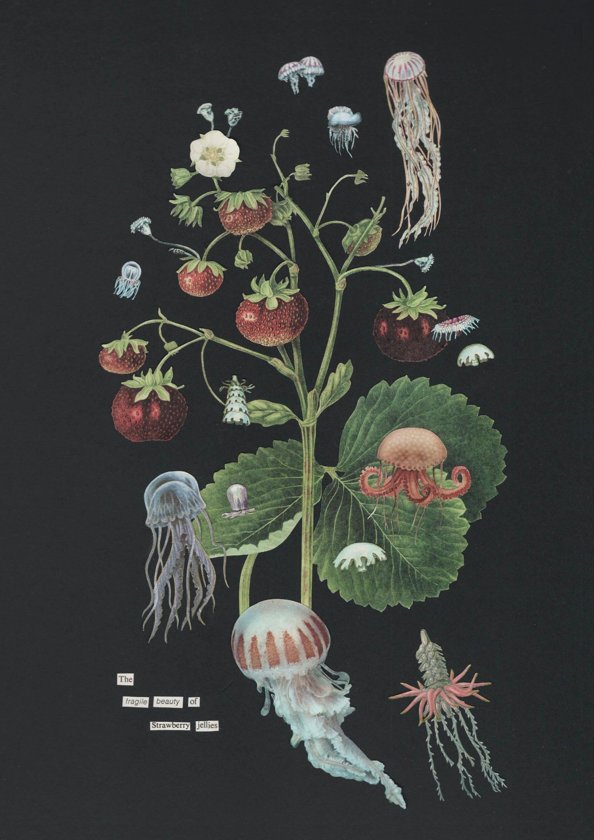Hand-cut collage on hot press black watercolor paper 9 x 12” Original artwork by Sarah Stoddard Made for Februllage 2026, Day 6: Jellyfish